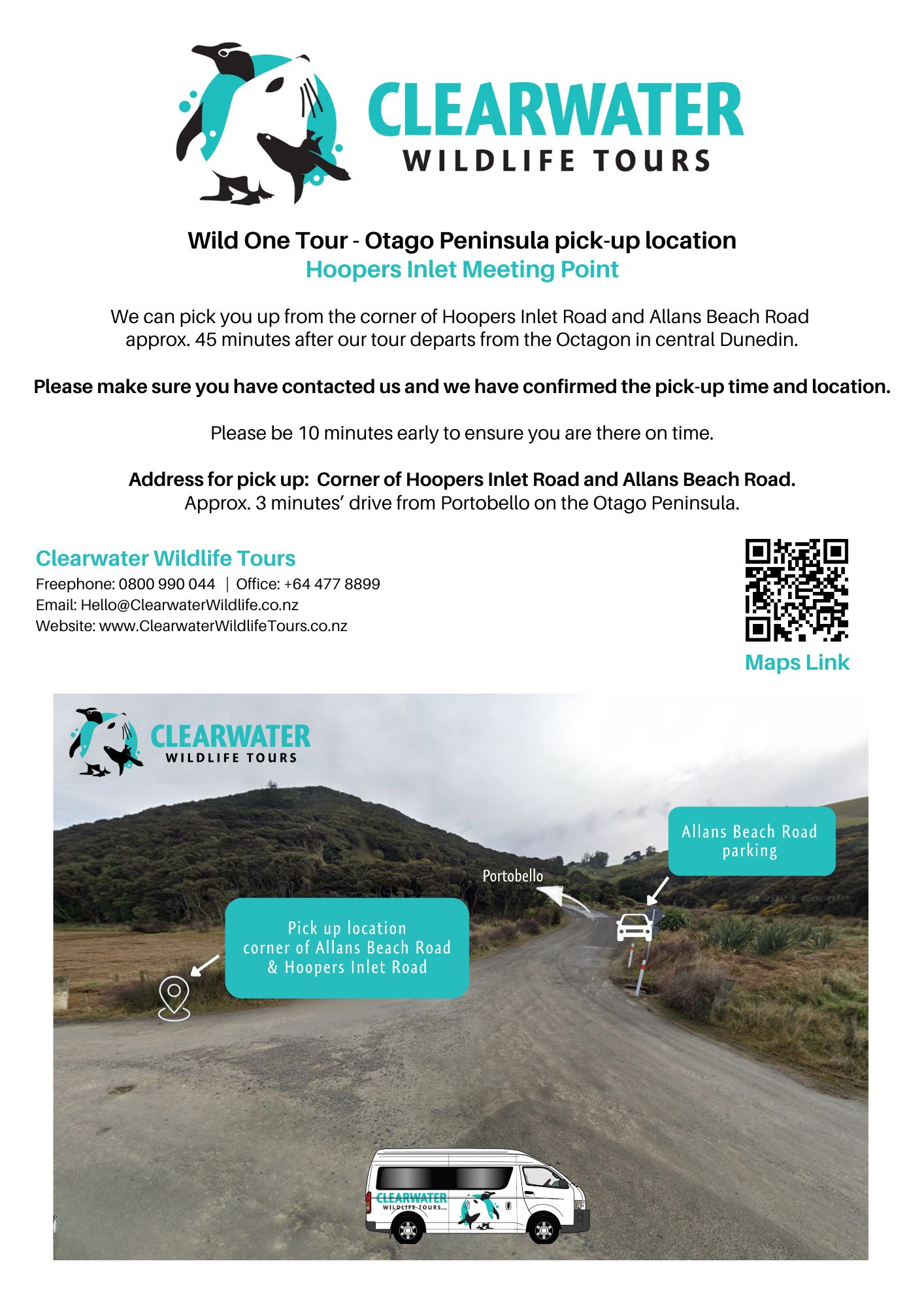 Alternative pickups must be confirmed with us 12 hours before tour departure. Contact us at hello@clearwaterwildlife.co.nz or phone +65 3 477 8899 to enquire.